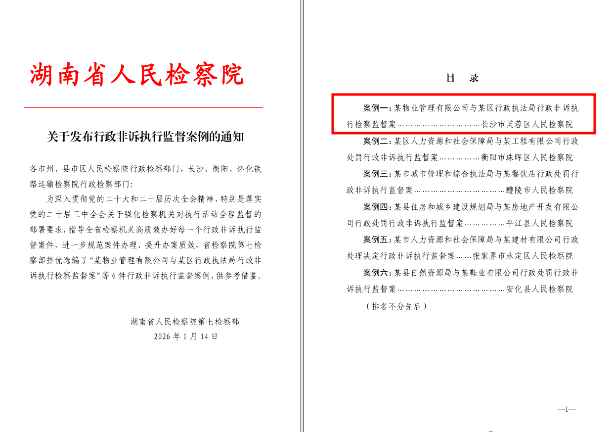 1月14日,湖南省人民检察院第七检察部下发《关于发布行政非诉执行监督案例的通知》,长沙市芙蓉区人民检察院办理的“某物业管理有限公司与某区行政执法局行政非诉执行检察监督案”成功入选。